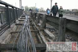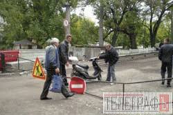 Перевірити хід ремонтних робіт на мосту приїхали представники „Укрзалізниці”. Окрім охоронців від фірми „Талєкріс”, що ремонтує міст, чергує й міліціонер. Проходи між бетонними блоками загородили пластиковими листами – скутери й велосипеди вже не проїдуть.