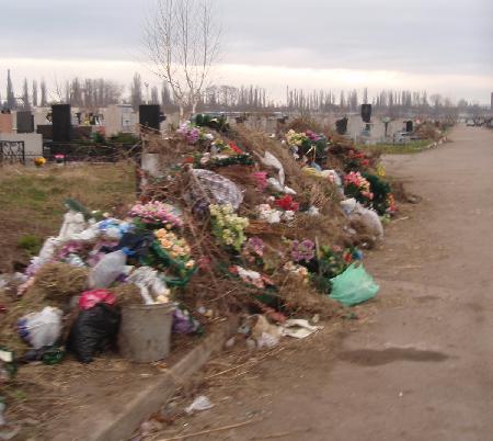 В пятницу на аппаратном совещании в горисполкоме начальник УЖКХ Александр Любенко пообещал мэру Николаю Глухову, что мусор с кладбищ до поминальных дней будет вывезен. В воскресенье репортер «Телеграфа» увидел совсем другую картину.
