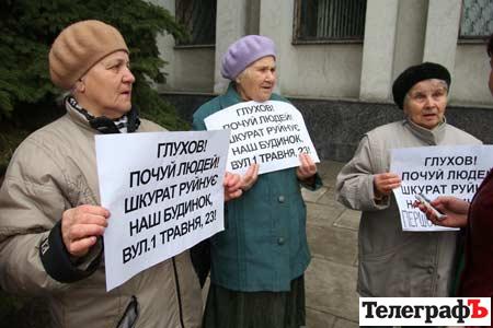 У день проведення сесії кілька бабусь, мешканок будинку на вулиці Першотравневій, 23 вийшли до міськвиконкому із гаслами «Шкурат руйнує наш будинок…». (Віктор Шкурат – керівник управляючої компанії «Житлорембудсервіс).