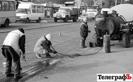 У районі мосту дійсно копирсаються ремонтники. Фрезою зняли шар асфальту, тепер поливають бітумом (із відра, віником) – готуються класти нове покриття. Температура повітря – мінус десять градусів. Робочі мерзнуть і час від часу хукають на руки. У рукавичках їм працювати незручно…