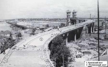 Металлические фермы для моста были изготовлены в Днепропетровске. В Чехословакии, по проекту инженера Кудрявцева, были изготовлены элементы подъемной части мостового прогона для пропуска под мостом суден. Вскоре двухъярусный мост был готов к пуску по верхнему ярусу автомобилей, а по нижнему – поездов.