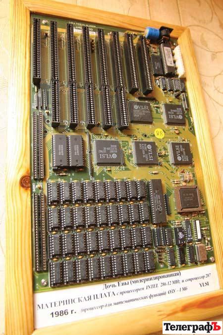 Наиглавнейший экспонат – материнская плата «дочери Евы» выпуска 1986 года с процессором Intel 286. Его тактовая частота – 12 Мегагерц (12 млн операций в секунду). В современных машинах она составляет около 4 Гигагерц – 4 млрд операций в секунду.