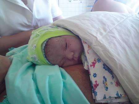 Ребеночку, только появившемуся на свет, дали кислородную маску и положили на маму: