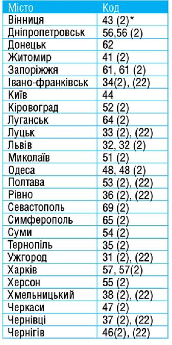 * 2 чи 22 додаються до коду, якщо телефонний номер коротший за сім знаків. 2 – для шестизначних номерів, 22 – для пятизначних.