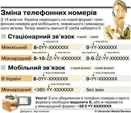 Відтепер «вісімка», з якої починаються всі міжміські дзвінки, зникне. І набирати номер, якщо ви телефонуєте до іншого міста, буде потрібно з нуля. Головне, не натисніть його двічі – інакше потрапите за кордон. І не забудьте – коди мобільних операторів також будуть змінені, тож телефонні номери у вашій мобілці доведеться підправити.