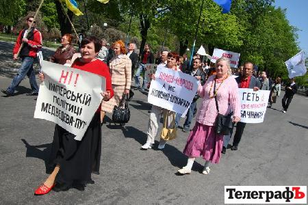 Сегодня в 12-00 от дворца культуры «Кредмаш» к памятнику жертвам сталинских репрессий проследовала колонна сторонников «правых» сил, которые также решили отметить Первомай и выступили за защиту своих конституционных прав.