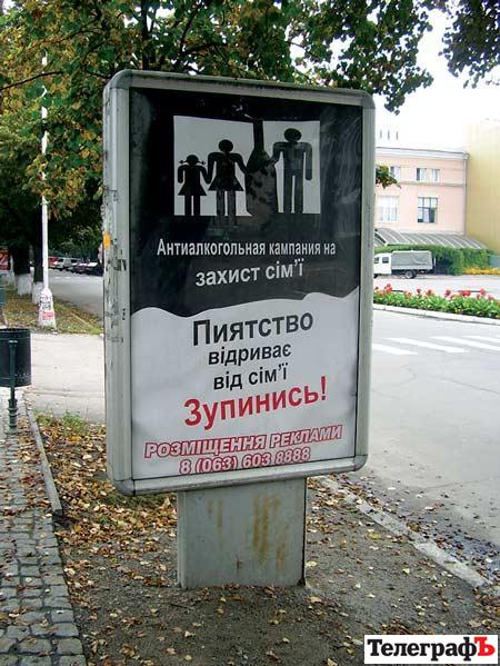 Цей сітілайт розташований у центрі міста на вулиці Леніна. На ньому одразу кілька помилок: «антиалкогольная», замість «антиалкогольна» (українською) та «пиятство», замість «пияцтво».