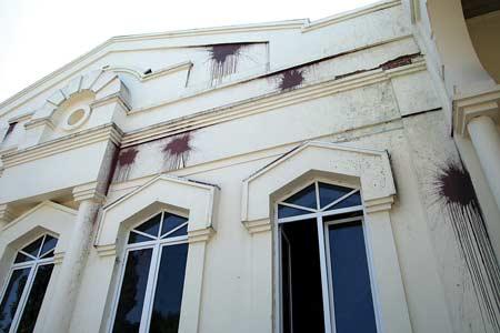 Наступного дня на фасаді будівлі «красувалися» сім плям. Одна зі склянок влучила у метало-пластиковий склопакет, який недавно замінили, і розбила зовнішнє скло.