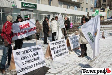 Роздавали листівки із закликом до людей «підтримати акцію громадянського гніву» та об’єднуватися для захисту своїх інтересів. Пікетувальники (в основному, підприємці) знову вийшли із вилами та косами та під знайомими гаслами, з якими першого лютого пікетували «Укрсиббанк»: «Долой кредитный геноцид», «Валютные кредиты – вне закона».