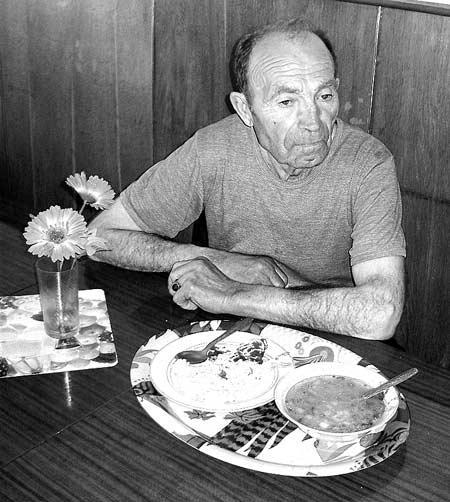 У нього на столі – «щира українська» їжа: борщ зі сметаною, салат із цибулею. Однак замовити таку смакоту на вечерю уже не вдасться – за додаткову плату годують лише обідами. А сніданок і вечеря – для всіх однакові: суп із хлібом.
