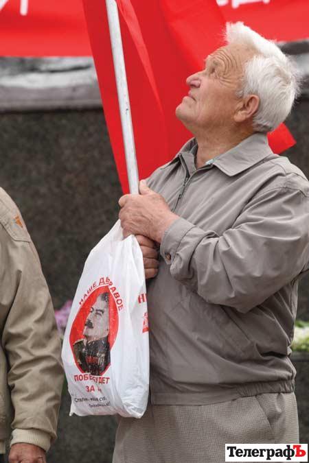 Митинг у мемориала проходил под Красными знаменами армии освободителей и не без портрета Иосифа Сталина.
