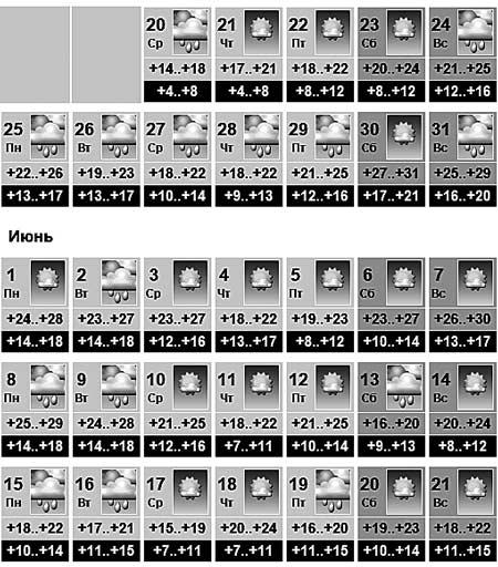 Початок травня не дуже-то порадував кременчужан гарною погодою – на наші голови полились зливи. Синоптики зазначають, що короткочасні невеличкі дощі триматимуться на всі травневі свята, і закінчаться після 10 травня. За прогнозами синоптиків сайту map1.com.ua, у Кременчуці погода поступово теплішатиме, від +20 градусів на День Перемоги до +25 градусів 14 травня. З 10 по 16 травня буде сухо, трохи дощитиме лише вночі 15 травня. А от далі, за даними сайту gismeteo.ua, на Кременчук чекають зливи. До кінця травня видасться лише чотири сонячні дні, в усі інші – дощитиме, температура у середньому становитиме +18…+22, але будуть дні, коли вона сягатиме +30. Більше кременчужан за прогнозами сайту порадує початок червня – його перший тиждень видасться сухим. А от далі сонце і дощі змінятимуть один одного. Температура повітря, що на першому тижні червня підніметься до позначки +30, наприкінці знизиться до +16…+23 градусів. Більш далекі прогнози синоптики поки що робити не беруться. Однак народні прогнозисти, зокрема відомий український синоптик Володимир Лис, зазначає, що липень стане сухим і теплим, майже без опадів, особливо перша частина. А наприкінці знов поллють короткочасні, однак сильні зливи, розповів він газеті «Сьогодні». У серпні погода буде мінливою – то дощ, то сонце, температура буде нижчою, ніж у липні.