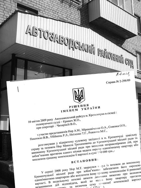 18 серпня 2008 року 85-річний інвалід Вітчизняної війни Микола Нор подав в Автозаводський районний суд Кременчука позовну заяву до Кременчуцької влади. Справа у тім, що пана Нора ще 28 листопада 1997 року взяли на квартирний облік. Він не має власної житлоплощі і, за своїм статусом, користується правом позачергово одержати житло (відповідно до пункту 18 статті 13 Закону України «Про статус ветеранів війни, гарантії їх соціального захисту»). Відповідно цього Закону житло має бути надане впродовж двох років з моменту взяття на квартирний облік. З того часу минуло більше 11 років, але пан Микола квартири так і не отримав. Він продовжує мешкати у 2-кімнатній квартирі сина на Молодіжному (житлова площа – 28,5 кв. м), де крім нього зареєстровано ще сім осіб.