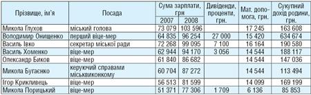 Отже, найбільшу зарплатню за минулий рік отримав, звісно ж, міський голова Микола Глухов. За рік йому нараховано більше 103-х тисяч гривень, а це десь по 8,6 тис грн на місяць. Звичайно ж, він є годувальником родини – його дружина заробила у 2,5 рази менше від свого владного чоловіка. Її заробітна плата склала 39,3 тисячі у рік (у середньому десь по три тисячі на місяць). Отримав міський голова минулого року і чималу матеріальну допомогу – 17,2 тис грн.