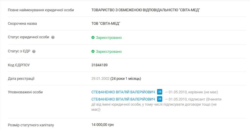 Схожа справа і з ТОВ «Медичний центр Світа». Ця компанія перебуває повністю у власності Стефаненка, і зареєстрована, як і попередня, як медустанова.