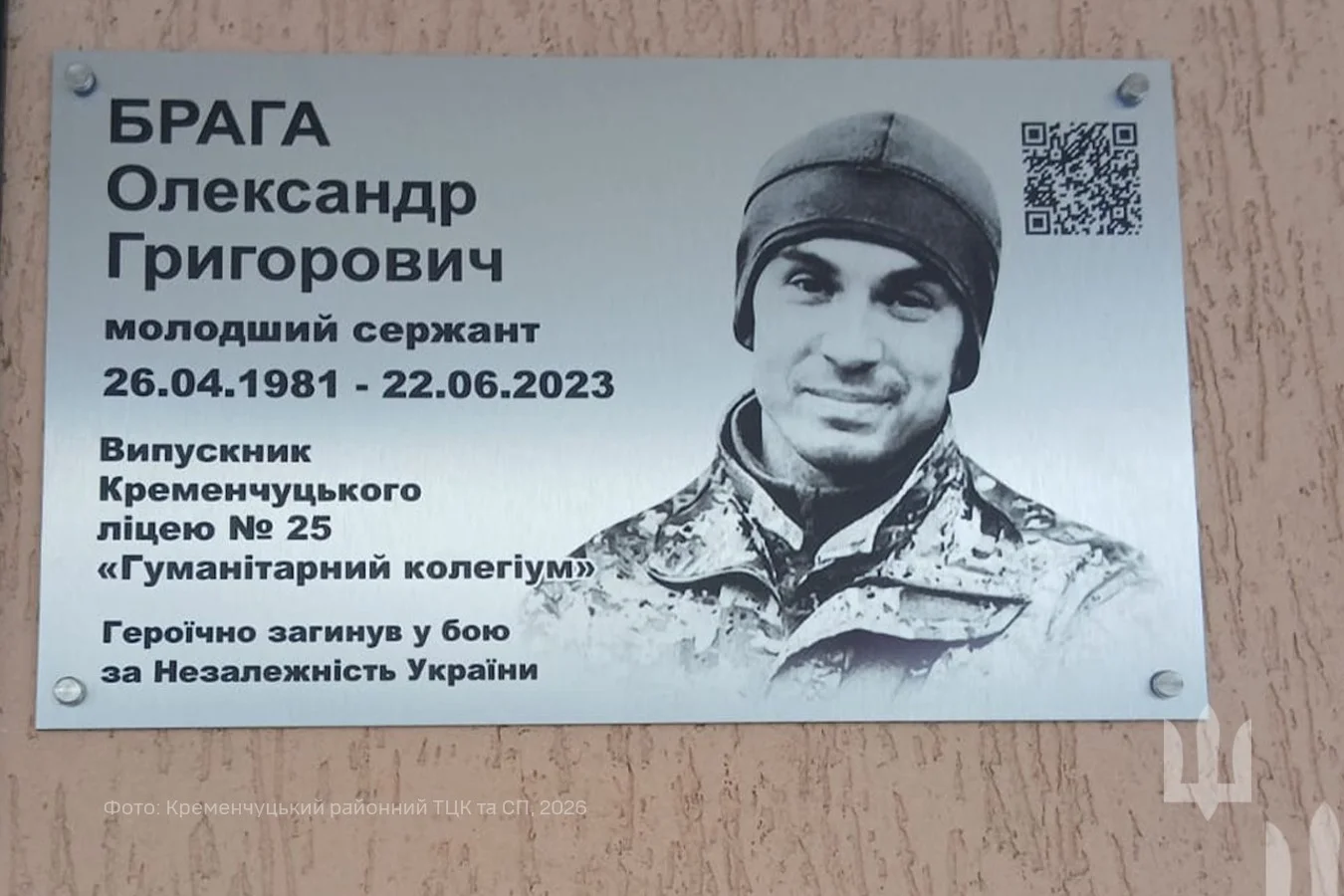 Сьогодні, 26 лютого, у Кременчуці на фасаді ліцею №25 «Гуманітарний колегіум» відкрили меморіальну дошку на честь полеглого військового Олександра Браги. Про це повідомили у пресслужбі Полтавського обласного Територіального центру комплектування та соціальної підтримки.