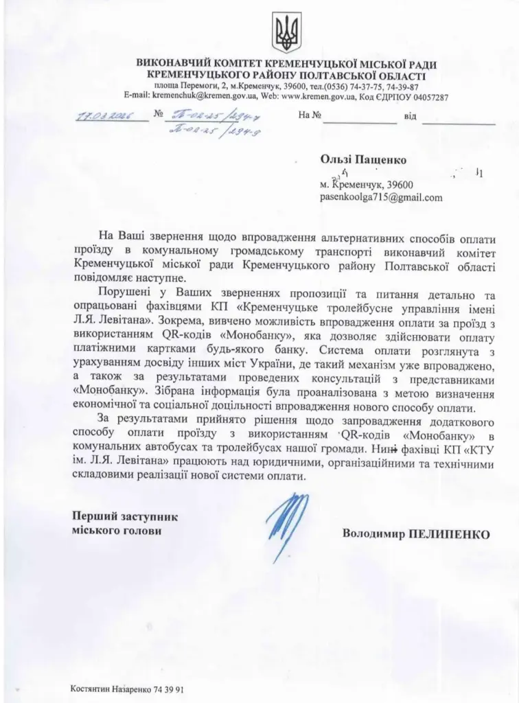Йдеться про впровадження додаткового способу оплати, який працюватиме у всіх тролейбусах Кременчуцького тролейбусного управління та комунальних автобусах. Пасажири зможуть швидко оплатити проїзд зі смартфона, відсканувавши QR-код у салоні транспорту.