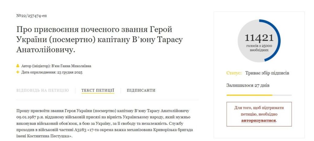 Продовжується збір підписів для розгляду петиції про присвоєння звання Герой України Тарасу В’юну, кавалеру ордена «За мужність», відважному воїну, вірному патріоту своєї країни, який пішов з життя 6 грудня 2025 року.