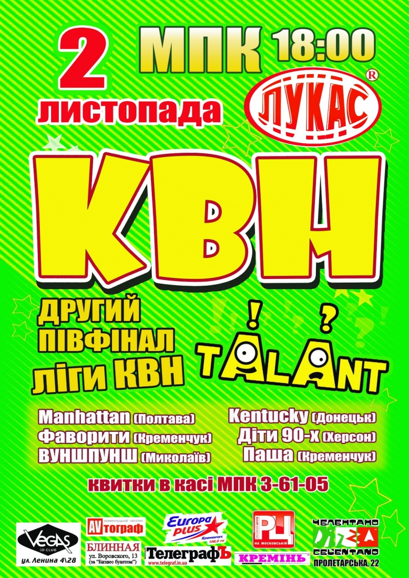 "Кременчугский ТелеграфЪ" разыгрывает 10 билетов на второй полуфинал лиги КВН "Талант", который состоится 2 ноября в 18:00 в ГДК. Пять участников розыгрыша получат по 2 билета.