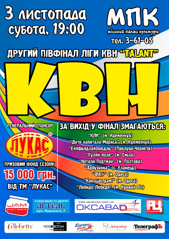 Билеты на концерты, представления и популярные вечеринки в городе "Кременчугский ТелеграфЪ" разыгрывает постоянно — следите за обновлениями на сайте. Нажимайте на кнопку ВЫИГРАЙ БИЛЕТЫ.