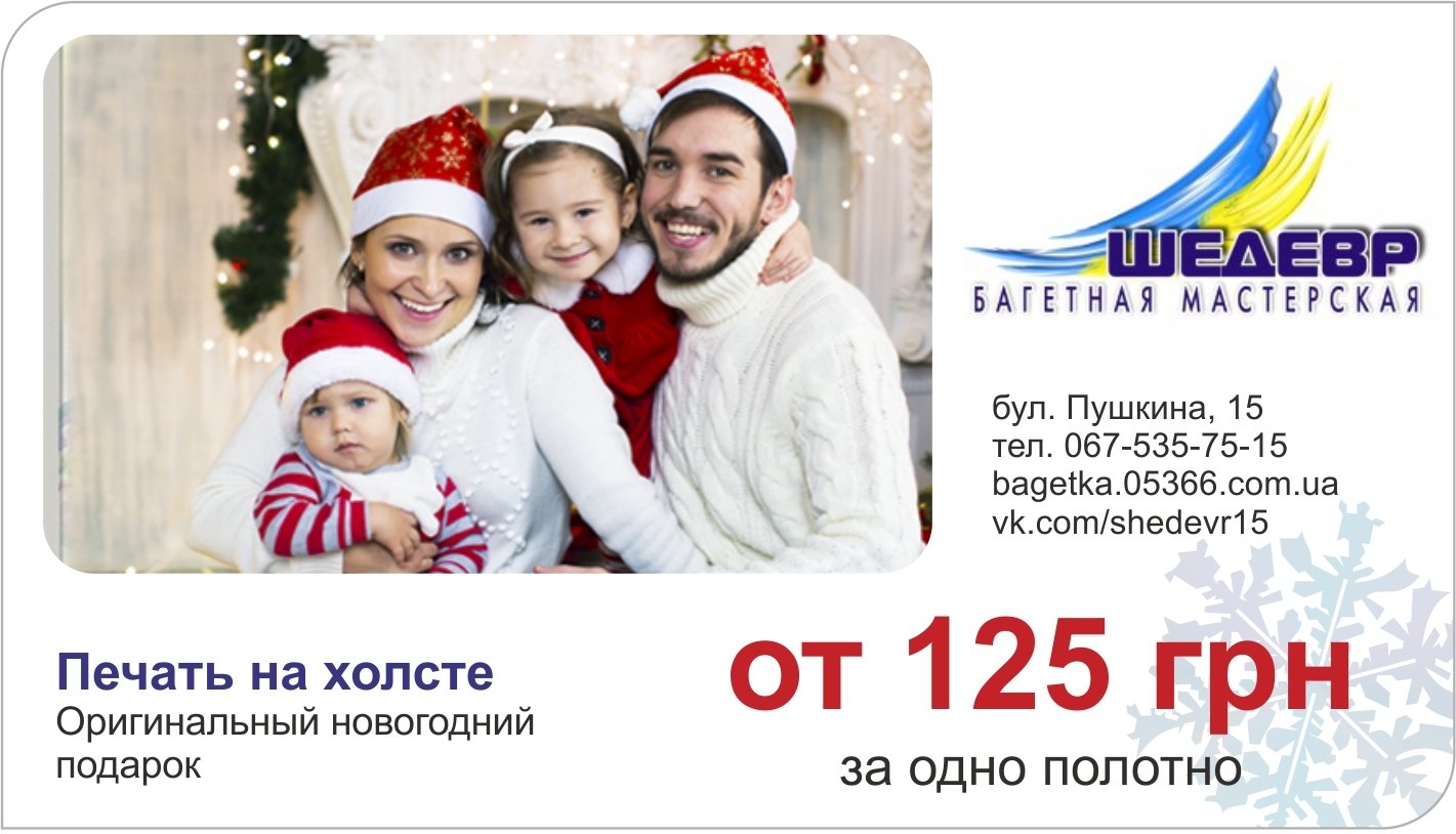 Для семьи отличный новогодний подарок печать общего фото на холсте. Закажите такой подарок заранее по акционной новогодней цене – от 125 грн.