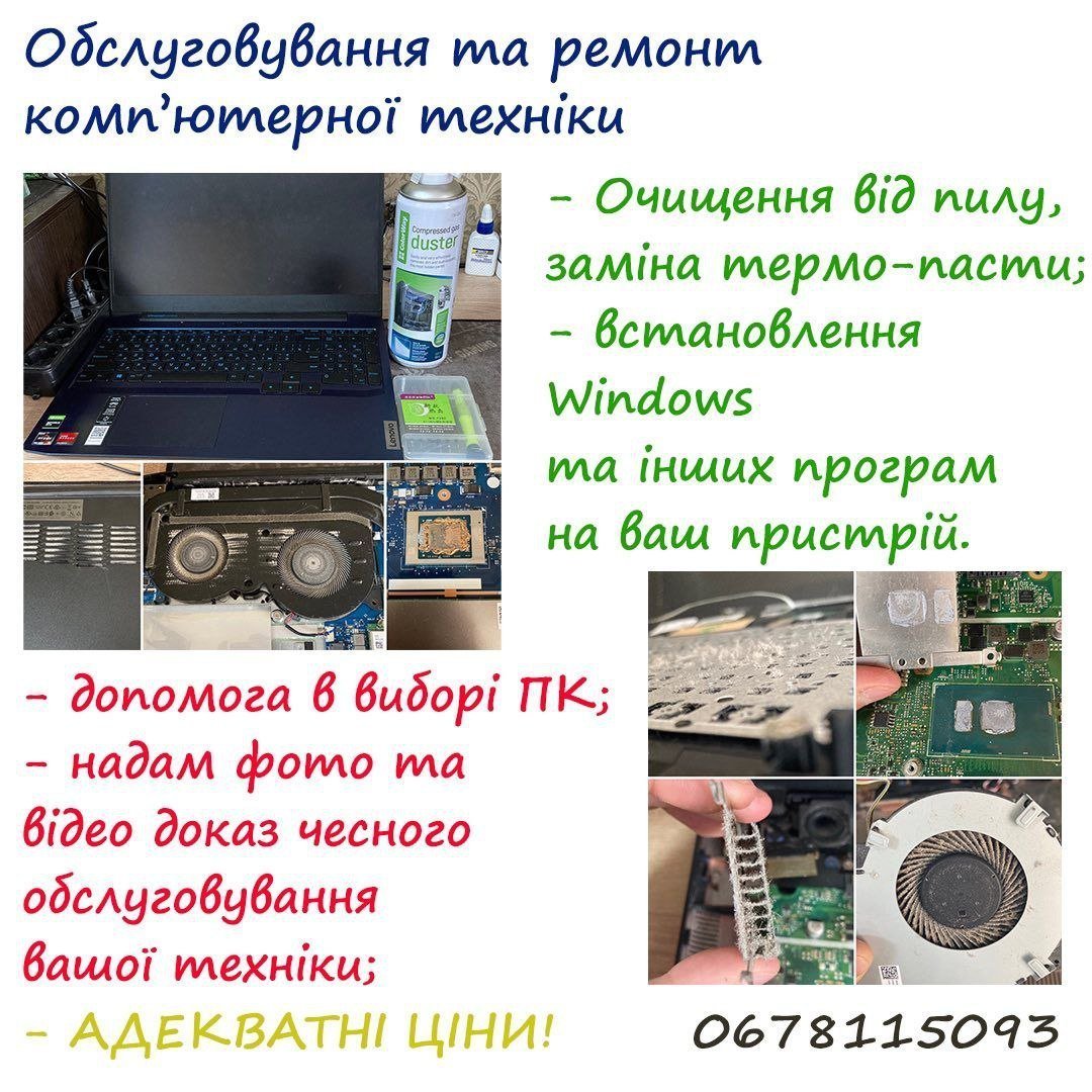 – усунення шкідливих програм та видалення вірусів;- очищення від пилу;- заміна термо-пасти;- встановлення Windows та інших програм на ваш пристрій;- налаштування роутера (Wi-Fi) та підключення до інтернета;??Працюю з комп’ютерною технікою більше 8 років.Також можу допомогти обрати нову та Б/В техніку під ваші потреби.Завжди надаю фото та відео з моменту ремонту/чистки вашої технікидля того щоб Ви були впевнені в тому що робота виконана і виконанаякісно.