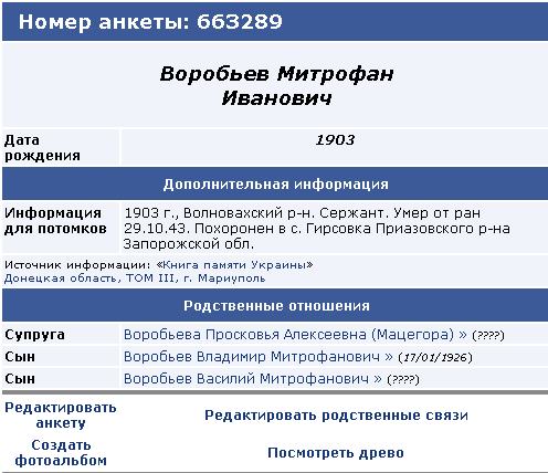 Кстати, таким образом кременчужанин обнаружил информацию о своем втором дедушке Воробьеве Митрофане Ивановиче, сведений о котором у него тоже не было. Александр набрал в Google имя отчество, фамилию и попал на анкету.