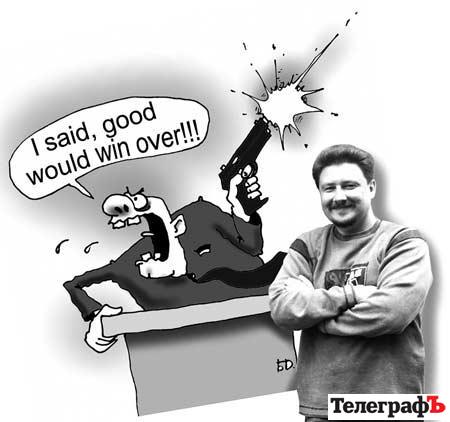 «Я сказав – добро переможе!!!» – саме ці слова кричить герой карикатури. Її Дмитро зробив, коли «Телеграф» готував черговий матеріал про бійку депутатів Верховної Ради. Ніхто вже не пам’ятає, яке питання вони тоді вирішували. Але це було щось мирне – навіть не про спікера. Може, про їжу або медицину. Та завершилось усе традиційним мордобоєм і кривавою юшкою з носів. Цю карикатуру Дмитро і надіслав на конкурс. В ЮНЕСКО гумор зрозуміли.