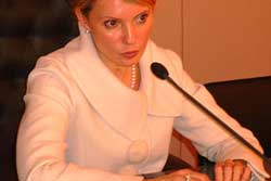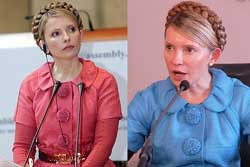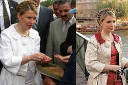 У фіолетовій сукні французької фірми Луї Віттон Тимошенко з’явилася на обкладинці журналу ELLE. У цій же сукні вона виступала перед депутатами в один із днів протистояння – наприкінці минулої сесії Верховної Ради. Більше того, у Тимошенко дві таких сукні. В аналогічній, але чорній, вона була на церемонії підписання декларації про недоторканість приватної власності в рамках українського Давосу в червні. Правильно це вбрання називається ‘сукня-пальто’. У московському магазині ‘Луї Віттон’ воно коштує 2 750 доларів.