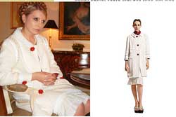 А ще Тимошенко має пальто м’якого біло-пісочного кольору з гудзиками у вигляді ягід калини. У московському магазині “Луї Віттон” таке пальто коштує 2 500 доларів. У парі до нього іде спідниця – коштує 1 050 доларів. Наслідуючи модель з сайту ‘Луї Віттон’, Тимошенко це пальто і спідницю носить в комплекті. У такому вигляді український прем’єр прилетіла до Парижу.