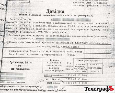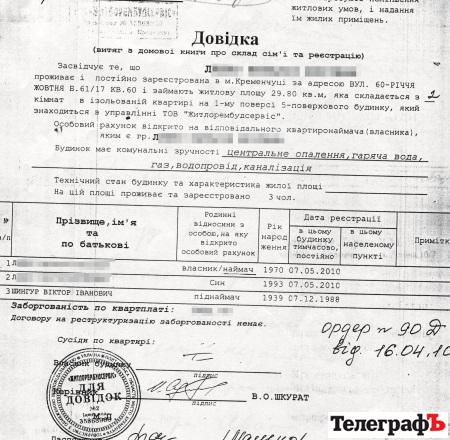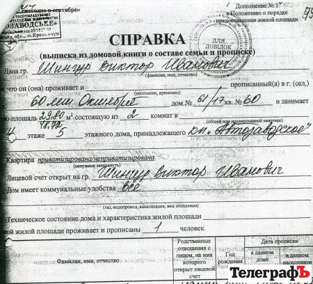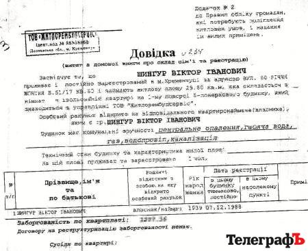 Це – найперша довідка про склад сім’ї та прописку художника Шингура в Кременчуці. Видана ще у 1988-му році, коли він приїхав до Кременчука і прописався в будинку № 61/17 по вулиці 60 років Жовтня. За довідкою, Шингур має статус наймача і прописаний в квартирі один. Довідка містить спеціальну помітку, яка з’явилася 21 січня 2005-го року, коли Шингур отримував свідоцтво на право власності на житло. У помітці вказано: «стан сім’ї не змінився». Тобто, ніякої співробітниці компанії «Житлорембудсервіс» і близько немає, коли художник отримує свідоцтво на право власності.