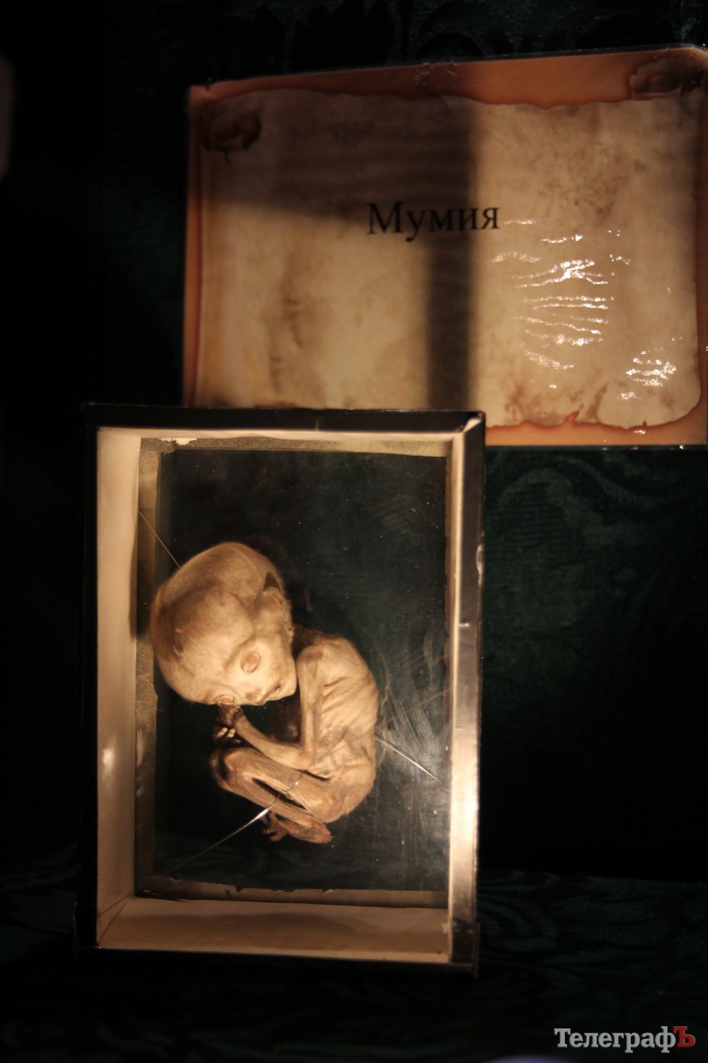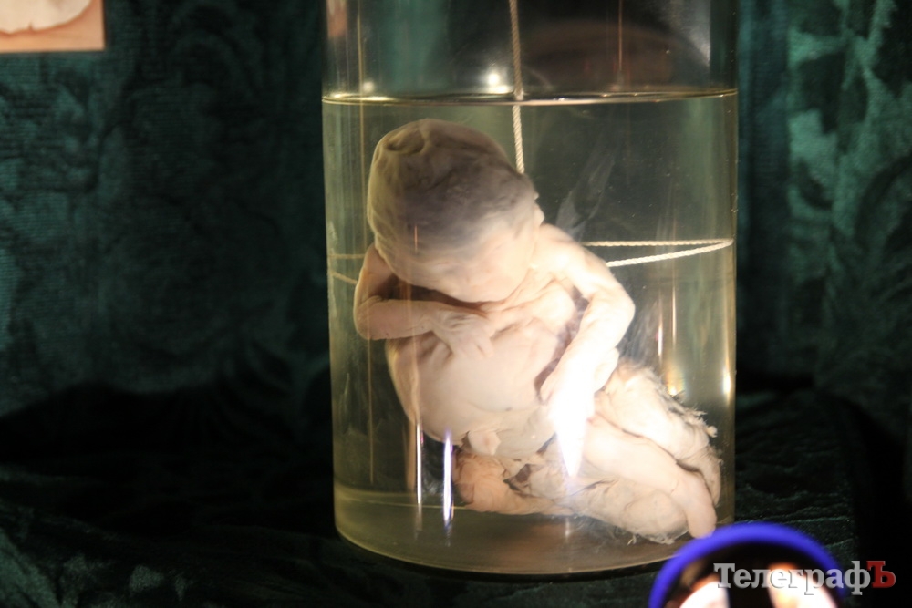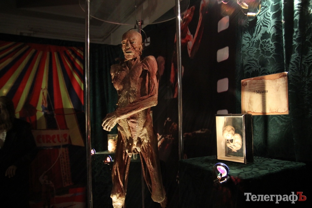 Мумия. На выставке представлены несколько видов «бальзамирования». Одно из них - естественное - небольшая мумия зародыша ребенка была найдена на Сахалине в торфяных болотах. Согласно исследованию, плоду было около 6-и месяцев. Учёные предполагают, что какая-то женщина, избавившись от беременности, скрыла это, спрятав тело ребенка в болотной тине.