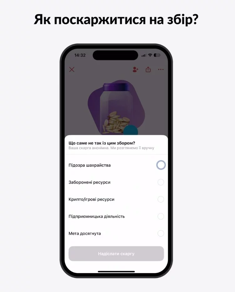 Користувачі можуть повідомляти про підозрілі збори коштів у застосунку