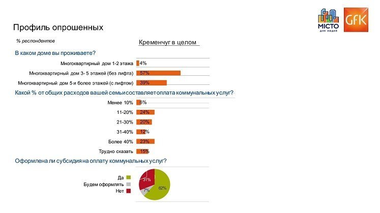 Витрати на оплату житлово-комунальних послуг у 23% кременчужан, які брали участь в опитуванні, проведеному компанією GfK, складають більше 40% від загальних витрат. Щомісяця платять зі свого бюджету від 31 до 40% – 12% респондентів. І тільки 6% опитаних платять менше 10% свого місячного бюджету.