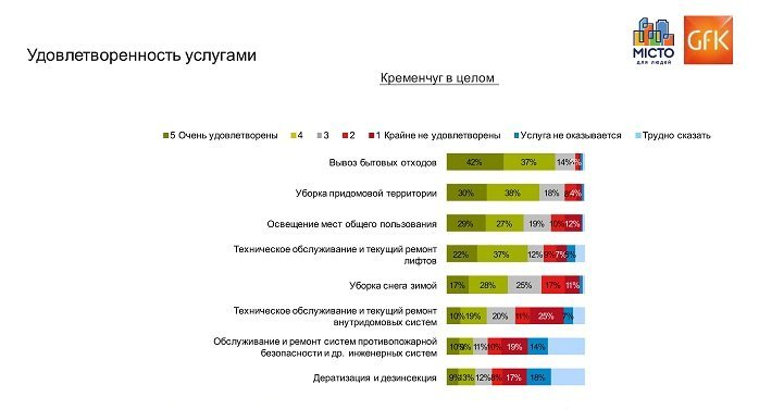 Для того що б це дослідження було прозорим і не викликало недовіру до нього з боку жителів нашого міста, керівництвом компаній «Місто для людей» було запропоновано провести оцінку задоволеності мешканців міста Кременчука якістю житлово – комунальних послуг провідній німецькій маркетинговій компанії GFK.