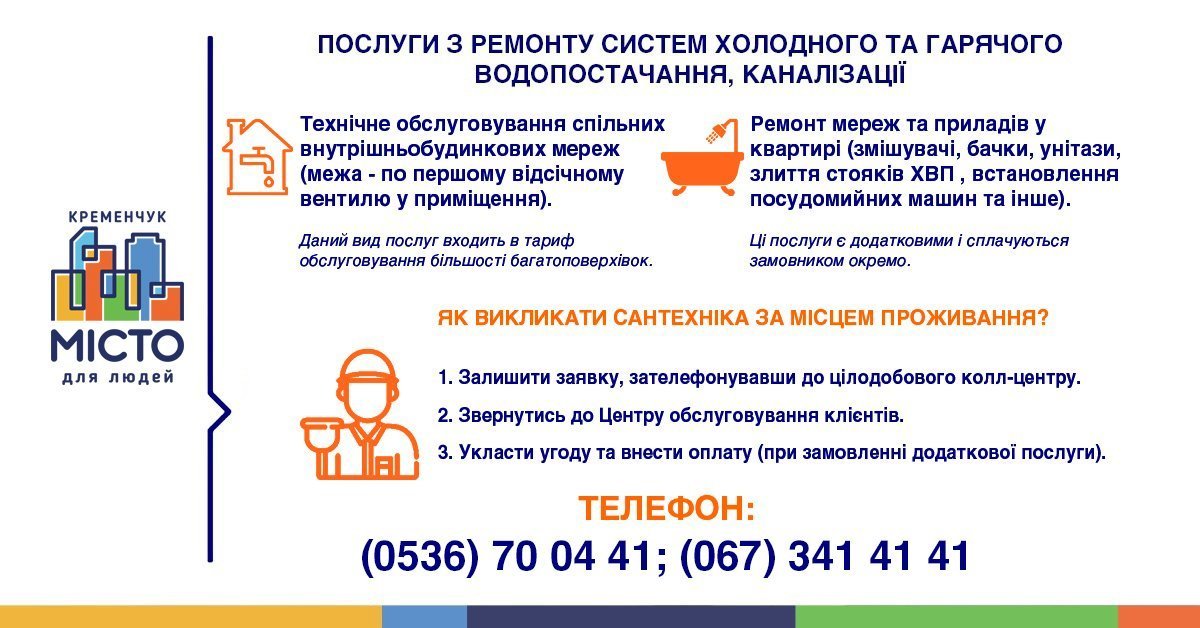 Викликати сантехніка з компанії «Місто для людей Кременчук» можна зателефонувавши до цілодобового колл-центру або звернувшись до центру обслуговування клієнтів. Аварійні заявки, такі як перекриття стояку водопостачання чи каналізації у разі протікання, виконуються безкоштовно. Робота аварійної бригади входить в тариф, який ви сплачуєте за квартплату. Сантехнічні роботи в місцях загального користування також виконуються за рахунок тарифу. А ось за проведення ремонту в квартирі прийдеться платити додатково.