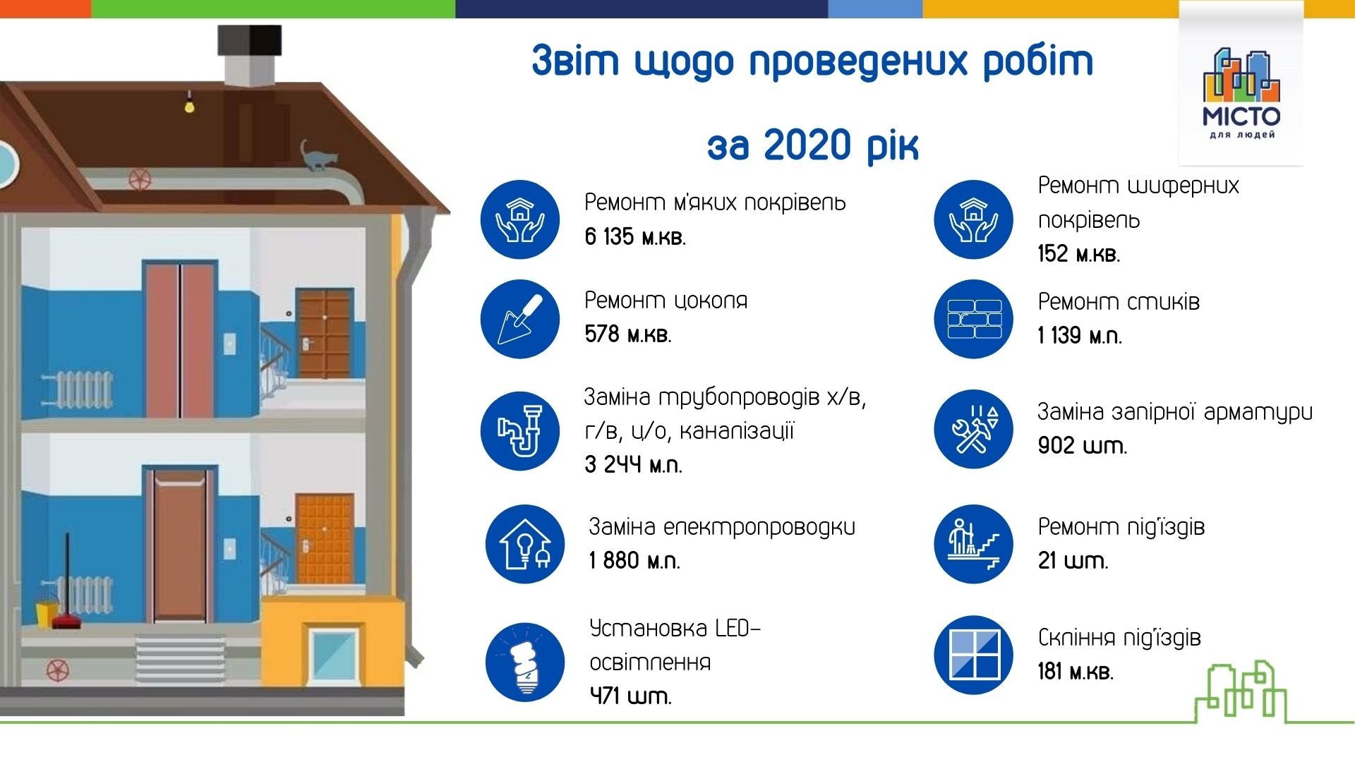 – Велика увага у 2020 році приділялася ремонту покрівель, адже вони відіграють важливу роль у якості проживання в будинку, особливо в зимовий час. За звітний період спеціалісти компанії відремонтували 6 135 м.кв. м’яких покрівель, виконали ремонт більше 1,1 тис.м.п. стиків. В рамках підготовки житлового фонду до опалювального сезону цього року ми провели заміну понад 3,2 тис.м.п. інженерних мереж (це труби центрального опалення, холодного і гарячого водопостачання, каналізації). Замінили більше 900 од. запірної арматури. Оновили близько 1,5 тис.м.п. теплоізоляції. Здійснили близько 180 м.кв. скління. Оновили більше 1,8 тис.м.п. електричних мереж. Для зниження витрат по енергозбереженню в місцях загального користування лампи розжарювання замінили на енергоефективні LED-світильники у кількості 471 шт. Також було відремонтовано 21 під’їзд багатоквартирних будинків.