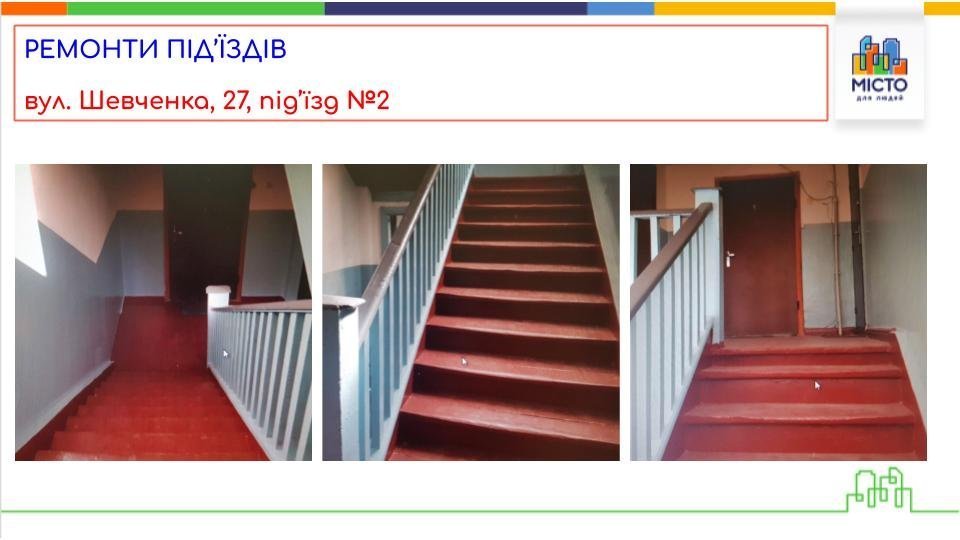 – Це проєкт співфінансування капітальних ремонтів від Департаменту ЖКГ. Наприклад, у будинку за адресою вул.Шевченка, 27 за рахунок коштів міського бюджету було виконано капітальний ремонт покрівлі, а компанія-управитель, тобто “Місто для людей”, виконала ремонти усіх під’їздів.