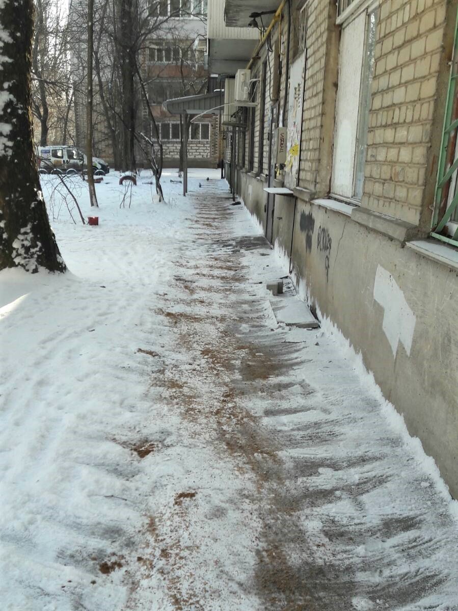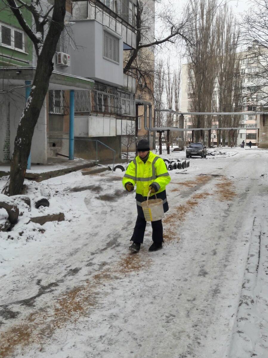 Фахівці компанії були на “низькому старті” та при настанні ожеледиці одразу приступили до її посипки. Для цього задіяли весь штат служби клінінгу. Робітники посипають піщано-сольовою сумішшю входи до під’їздів, сходинки ганків, пішохідні доріжки біля будинків. Суміш розвозиться автотранспортом компанії за адресами, де її отримують робітники та вручну посипають прибудинкову територію. Щоденно витрачається близько 5 тонн суміші