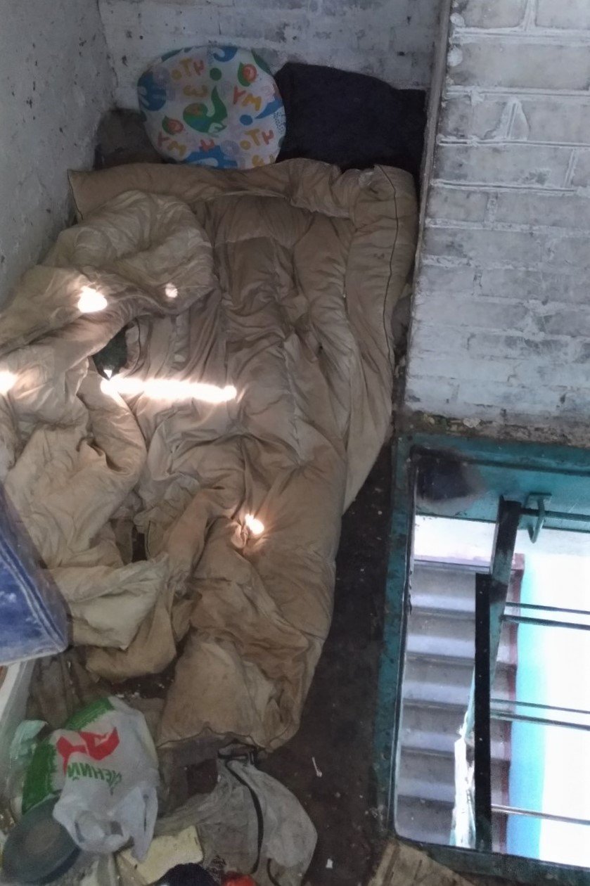 У Кременчуці по вул. Першотравневій, 40 у машинному відділенні будинку спеціалісти компанії виявили ознаки життєдіяльності безхатченка: подушку, матрац, одяг та навіть продукти.