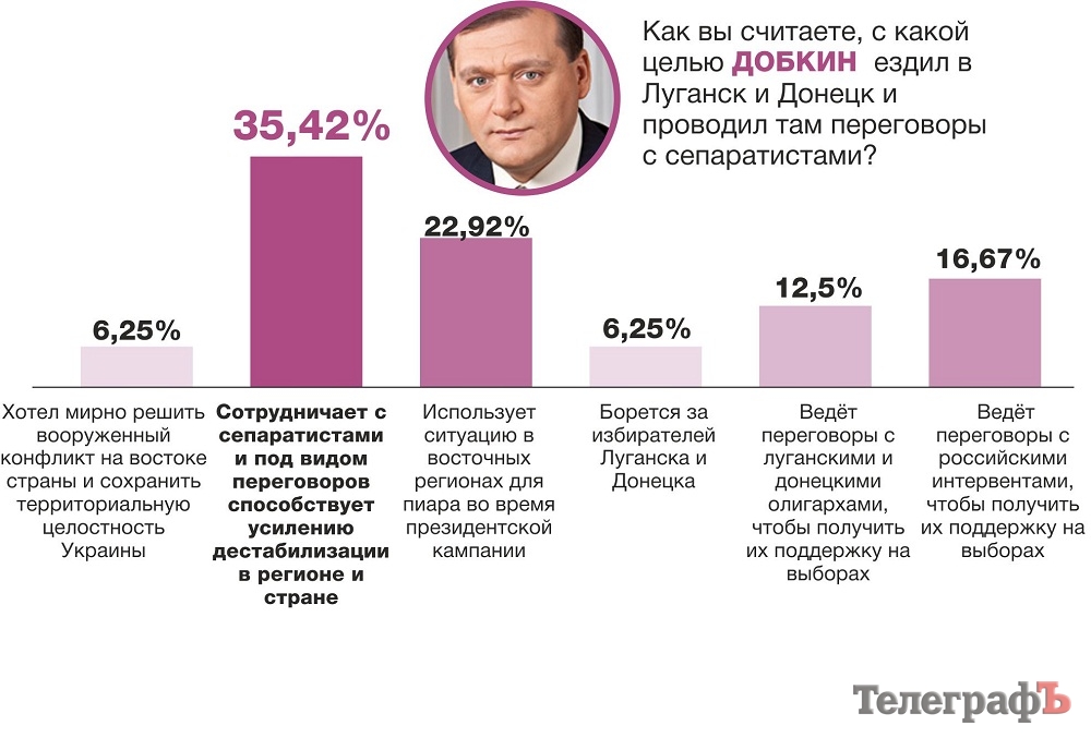 35,42% проголосовавших считают, что кандидат Добкин сотрудничает с сепаратистами и под видом переговоров с ними способствует усилению дестабилизации в регионе;