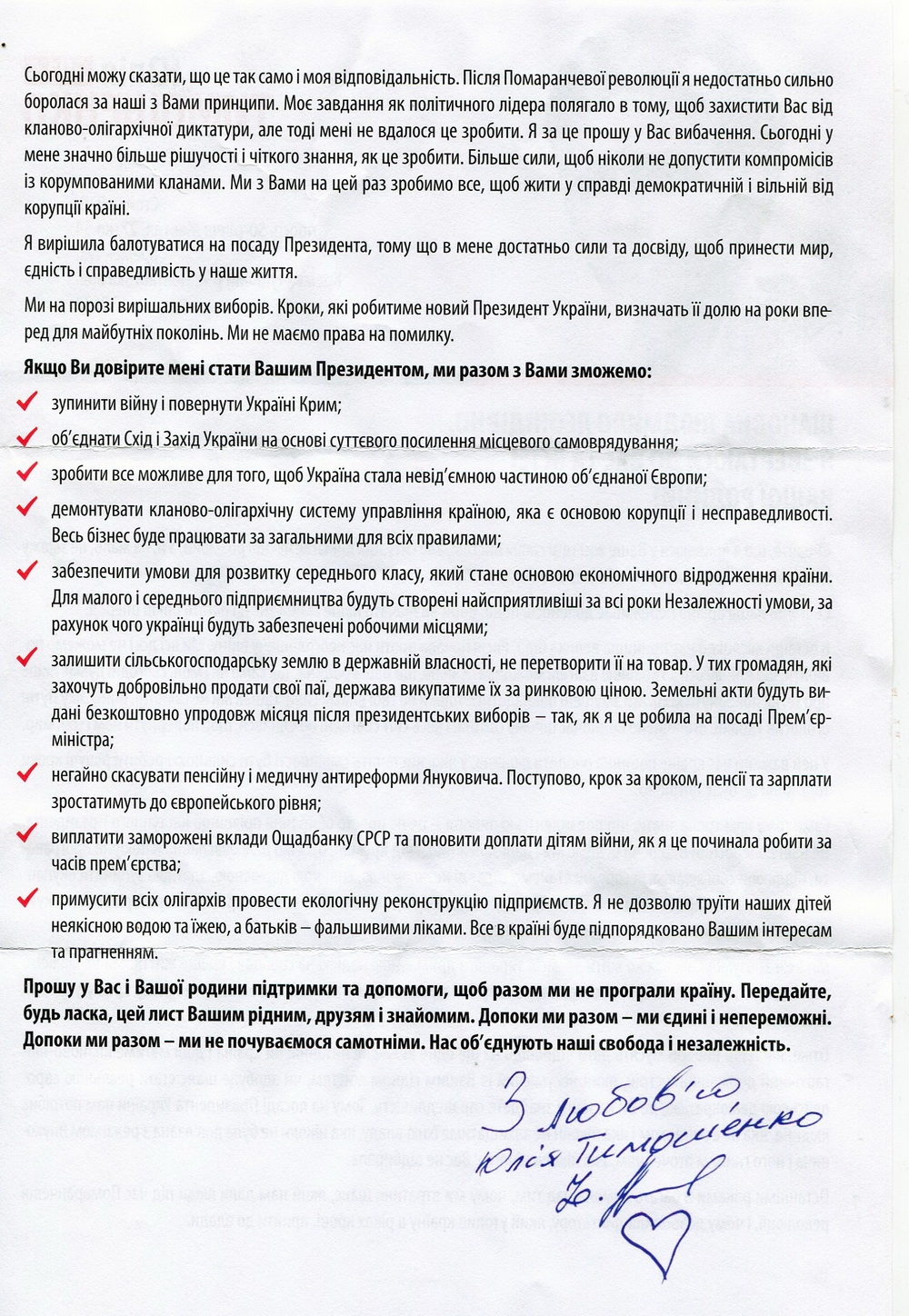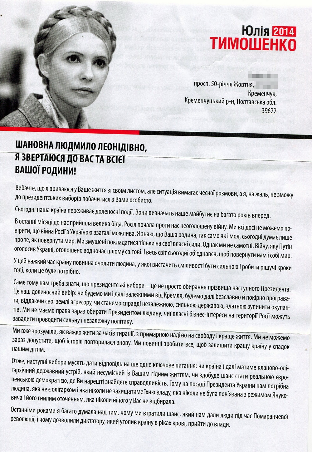 Напомним, на внеочередных выборах, которые состоятся 25 мая, Юлия Тимошенко баллотируется в президенты. Письмо, которое получила от её имени кременчужанка Людмила Леонидовна, содержит призывы не голосовать за одного из кандидатов, а также предвыборные обещания от Юлии Тимошенко. Важно, что начинается письмо не стандартной фразой «Шановний виборцю», а адресным обращением «Шановна Людмило Леонідівно, я звертаюсь до вас та всієї вашої родини! Вибачте, що я вриваюся у ваше життя зі своїм листом, але...».