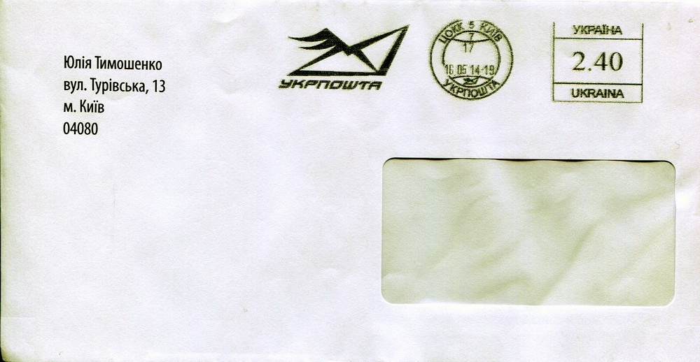 Кременчужанка Ольга 23 мая принесла в редакцию «Телеграфа» письмо, которое испугало её пожилых родителей-пенсионеров. В четверг, 22 мая, мать Ольги – Людмила Леонидовна – проверила почтовый ящик и нашла там два письма – на её имя, и на имя мужа. На конвертах стоял киевский штемпель (смотри фото) и было указано, что их отправитель Юлия Тимошенко.