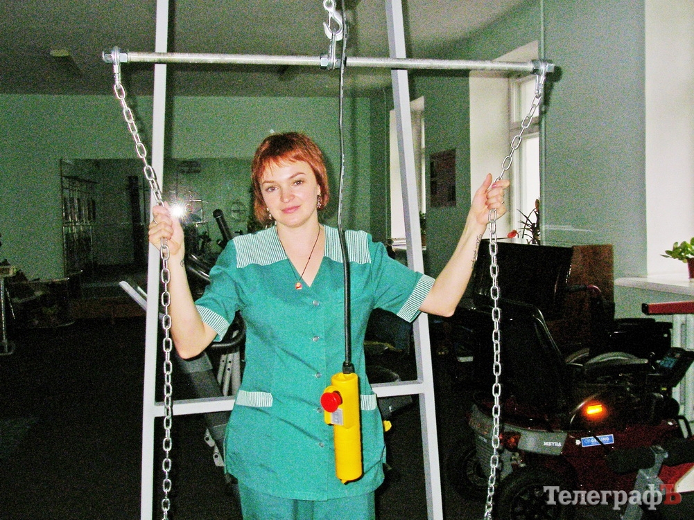 На фото: Штатный психолог госпиталя, инструктор по лечебной физкультуре Алина Базалевская показывает, как работает тренажер-вертикализатор