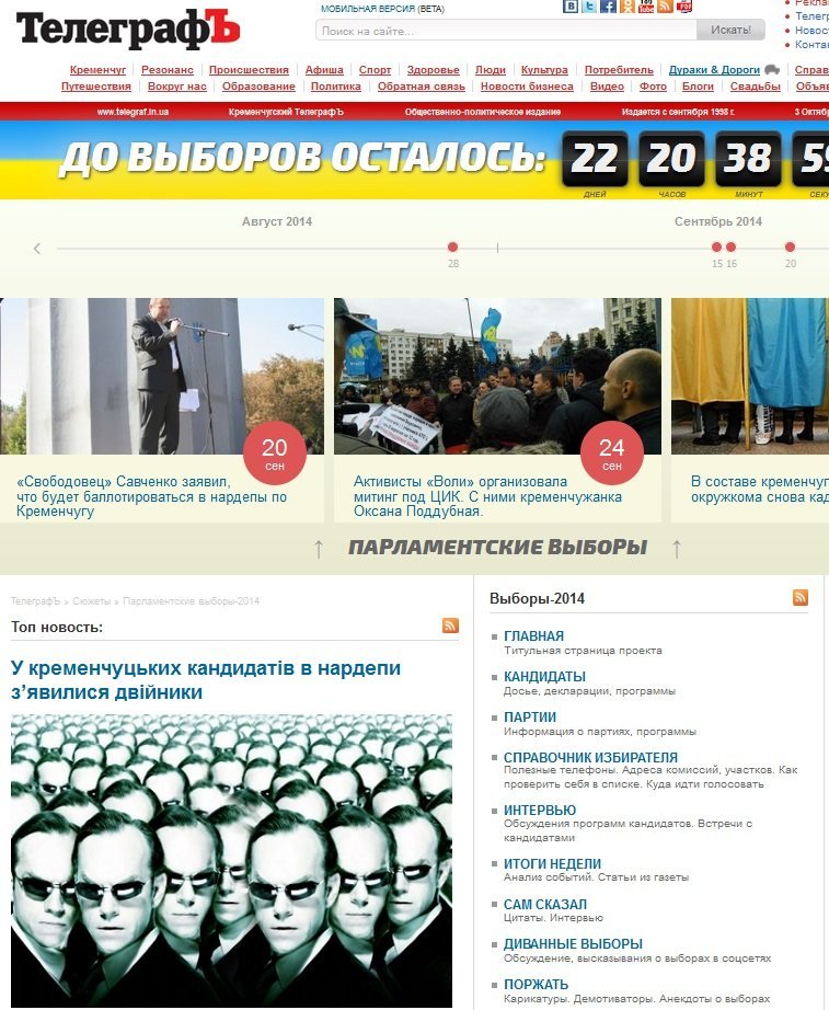 «Кременчугский Телеграф» на время избирательной кампании запустил политический проект «Парламентские выборы-2014». Чтобы зайти на страницу проекта, нужно кликнуть на Проект: Парламентские выборы-2014» над ТОП-новостью или кнопку под «Другими топ-новостями».