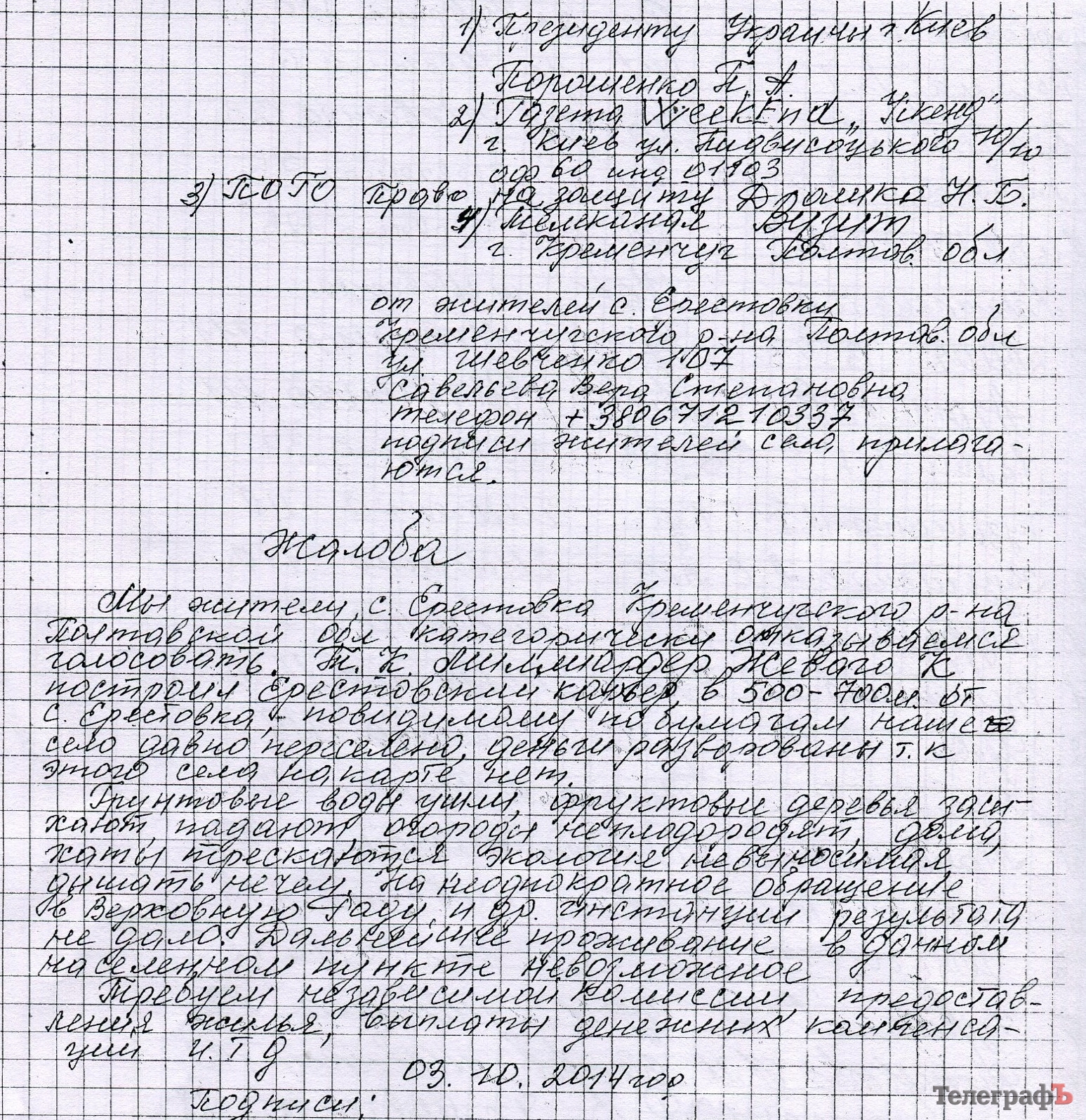 14 октября кременчугский общественный активист Юрий Жоган передал «Телеграфу» копию письма-обращения жителей села Еристовка к Президенту Украины Петру Порошенко. Письмо содержит 33 подписи.