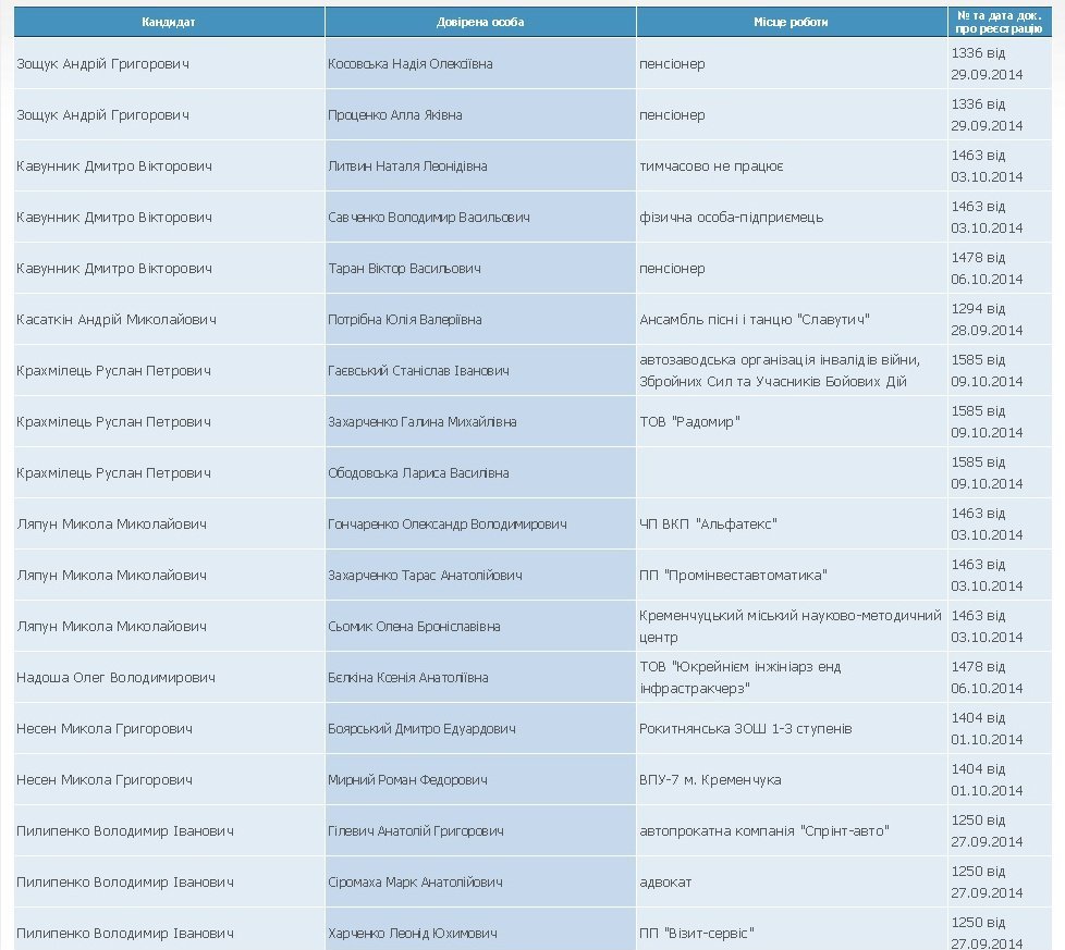 Так, у кандидата-пенсионера Андрея Зощука в доверенных лицах также пенсионеры Надежда Косовская и Алла Проценко; у кандидата Дмитрия Кавунника трое доверенных лиц — среди них экс-нардеп Виктор Терен; у кандидата Андрея Касаткина всего одно доверенное лицо – Юлия Потрибна. По одному доверенному лицу и у кандидатов Олега Надоши и Владимира Шайноги.