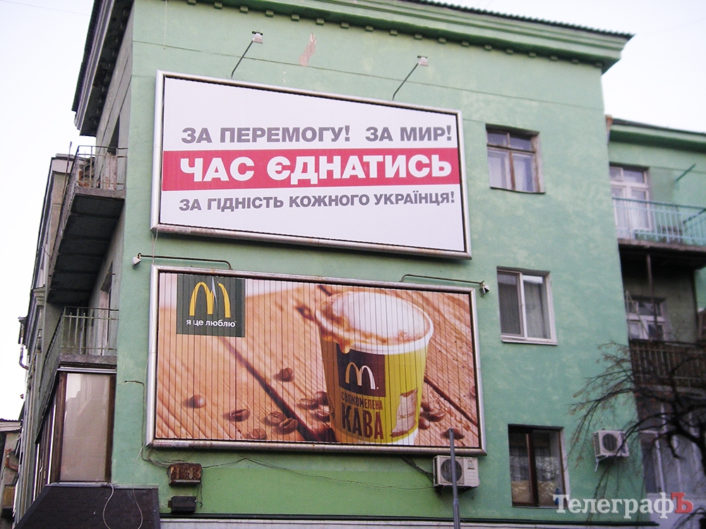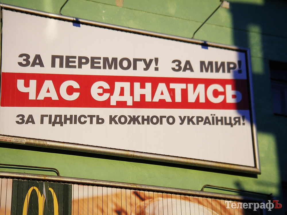 Слоган, напечатанный на борде – «Час єднатись!» – также является слоганом, который регулярно использовался в агитационных материалах указанной партии и кандидата от этой партии в Кременчуге.