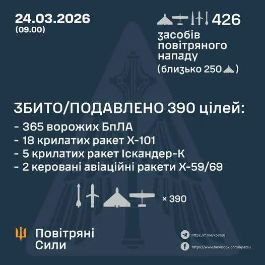 За попередніми даними, станом на 09.00, протиповітряною обороною збито/подавлено 390 цілей – 25 ракет та 365 безпілотників різних типів: