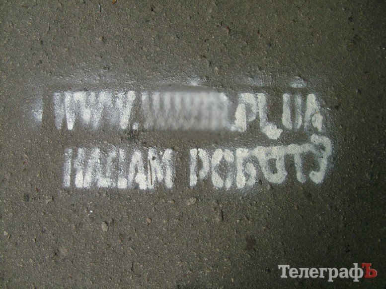 Кременчужан вербуют для работы на выборах. Утром 9 июля практически все тротуары в районе Водоканала белели свежими, нанесёнными под трафарет, объявлениями: «Надам роботу www.***.pl.ua».